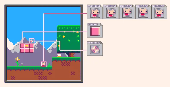 There are a few different ways game engines could handle drawing a frame like this. One way is to load a bunch of separate image files — one for each sprite — and draw each one in its corresponding position in the frame. Indeed, many game engines support this workflow, and if I were inventing a game engine from first-principles, this is probably what I’d come up with.